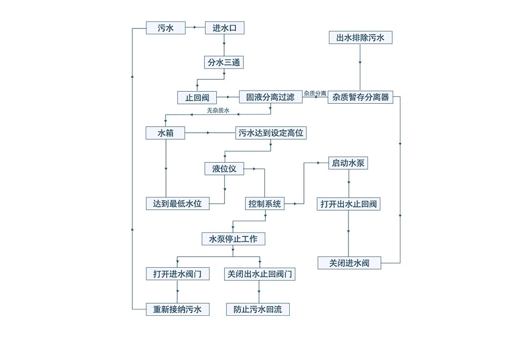 采用雜物污水分離器結構,使水泵與可纏繞型雜物不接觸,避免雜物纏繞堵塞水泵葉輪好而燒壞水泵電機;具有反沖洗功能,使得設備內不會產生沉淀,實現了無沉淀,免清掏,大大節約了設備運行和管理維護的成本。